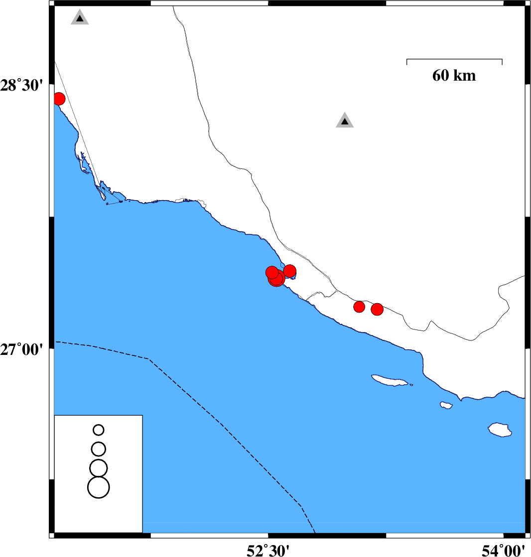 2025/07/26 | 10:10:02.4 | 13:40:02.4 | 27.403 | 52.552 | 12 | ML:4.9 | Persian Gulf, 37 km South-West of Mehr | ||