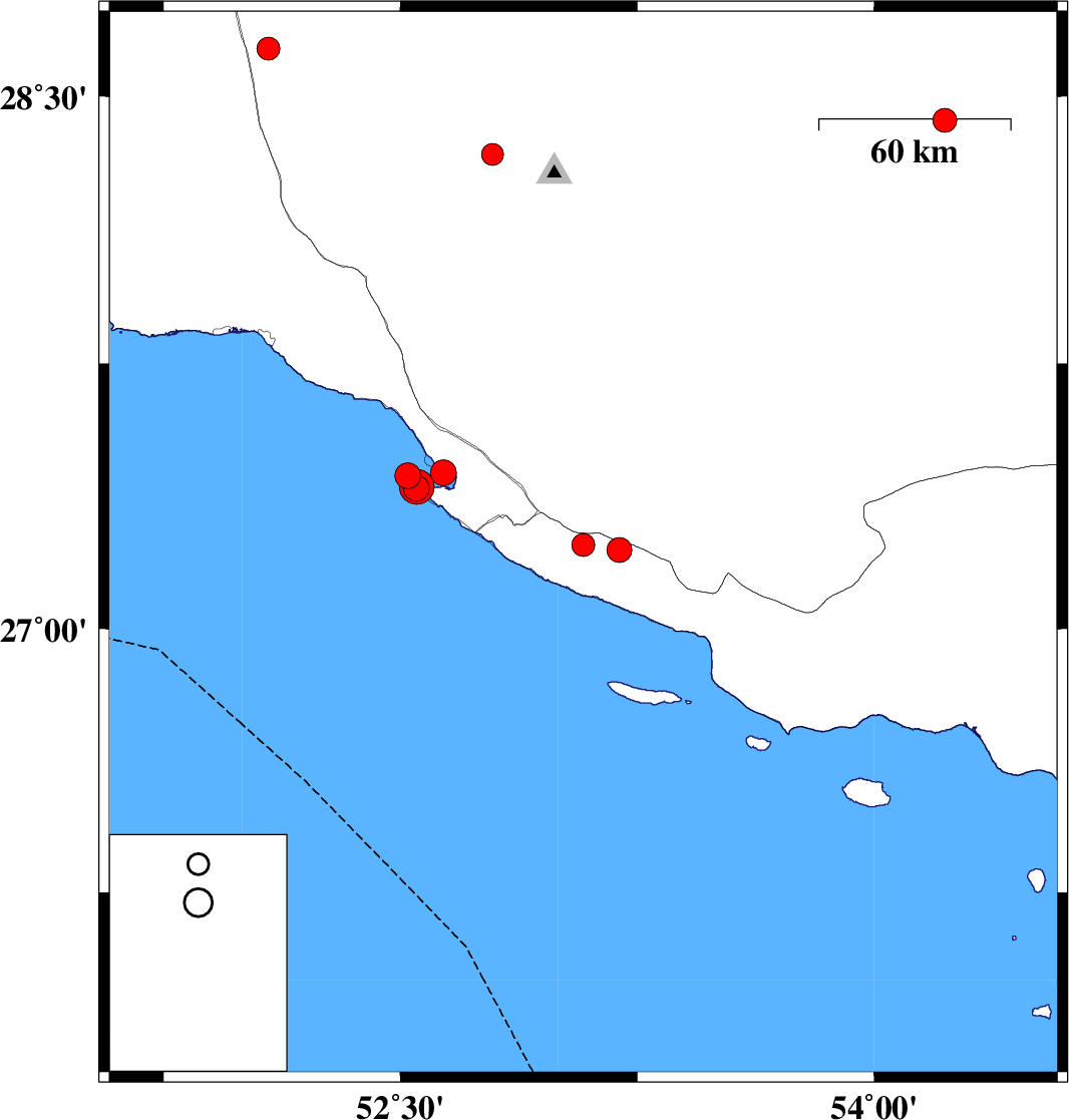 2025/07/26 | 10:55:28.1 | 14:25:28.1 | 27.398 | 52.551 | 12 | ML:3.7 | Persian Gulf, 37 km South-West of Mehr | ||
