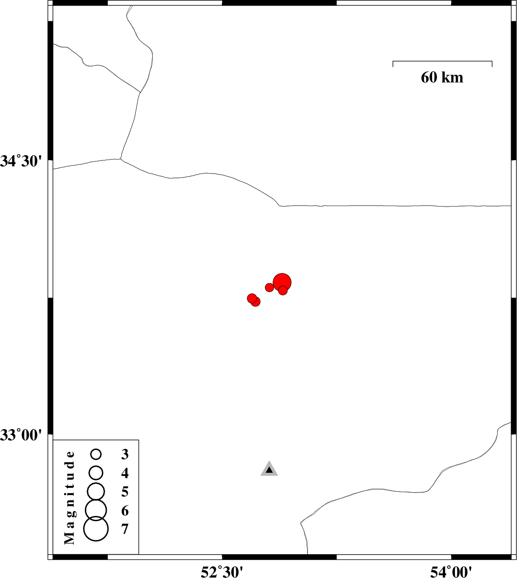 2025/10/02 | 23:03:16.3 | 02:33:16.3 | 33.79 | 52.897 | 12 | ML:2.7 | Esfahan Province, 67 km North-East of Ardestan | ||