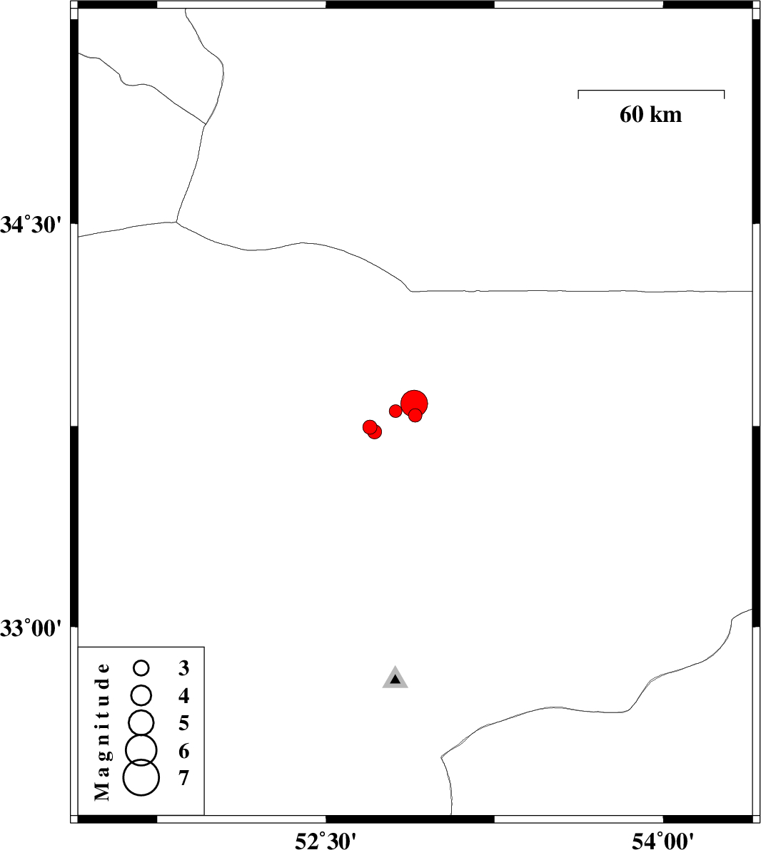 2025/10/02 | 21:57:34.5 | 01:27:34.5 | 33.746 | 52.696 | 12 | ML:2.8 | Esfahan Province, 50 km North-East of Ardestan | ||