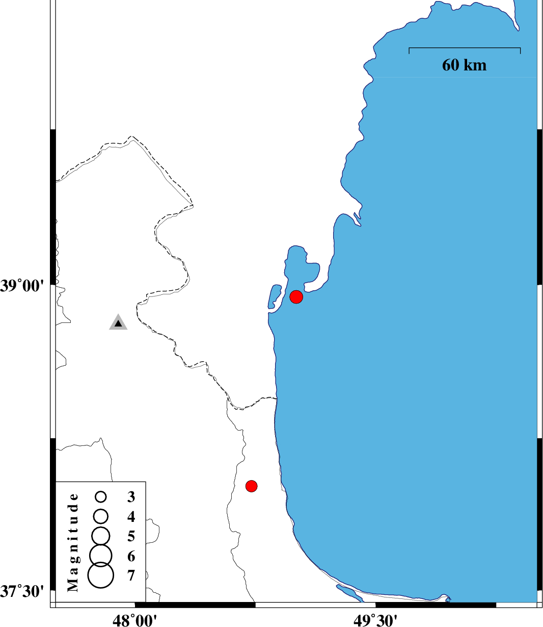 2025/10/05 | 01:36:16.3 | 05:06:16.3 | 38.941 | 49.004 | 12 | ML:3.6 | Caspian Sea, 59 km North-East of Astara | ||
