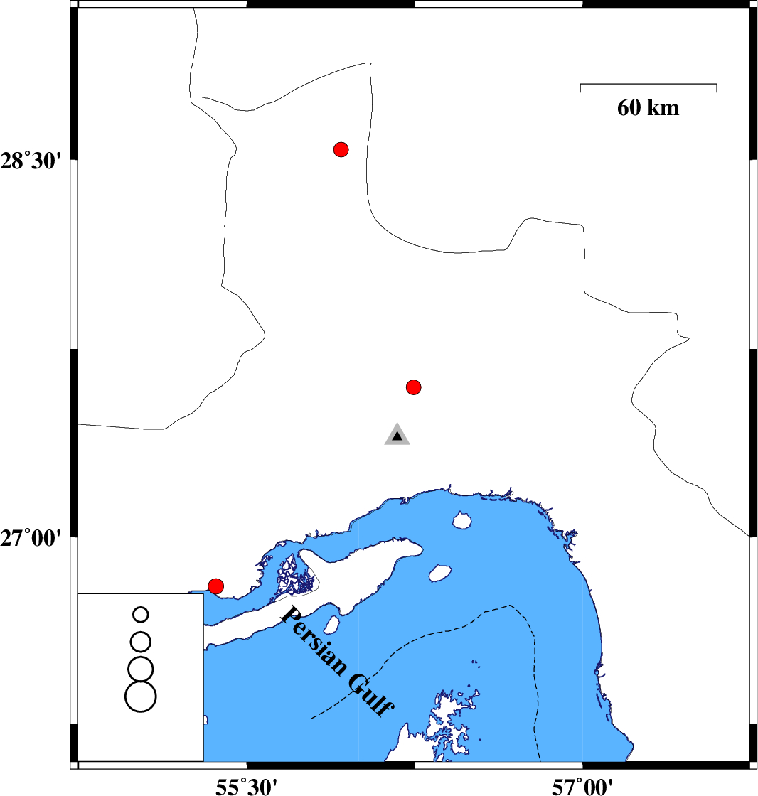 | 2025/10/19 | 22:57:54.8 | 02:27:54.8 | 27.598 | 56.244 | 12 | ML:2.9 | Hormozgan Province, 46 km North of Bandar-e abbas | ||