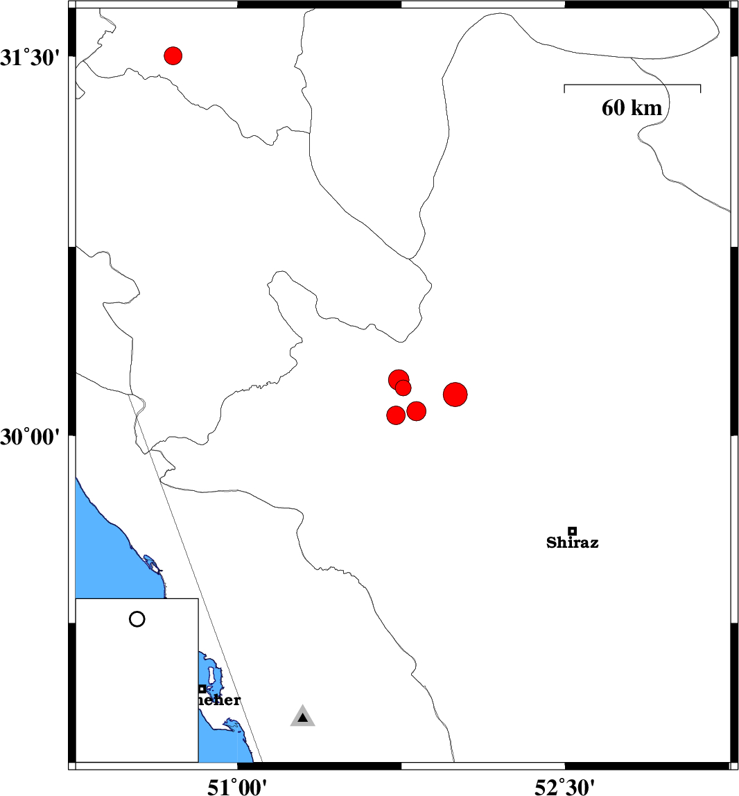 | 2025/10/19 | 03:12:05.8 | 06:42:05.8 | 30.08 | 51.725 | 12 | ML:3.8 | Fars Province, 20 km -East of Nurabad |