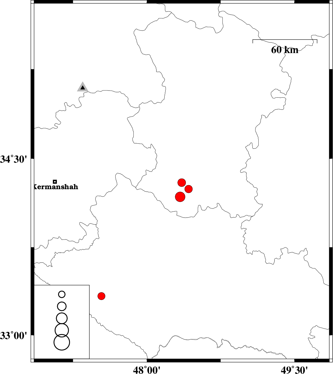 | 2025/10/26 | 16:09:25.6 | 19:39:25.6 | 34.178 | 48.338 | 12 | ML:4.5 | Hamedan Province, 3 km of Nahavand | ||