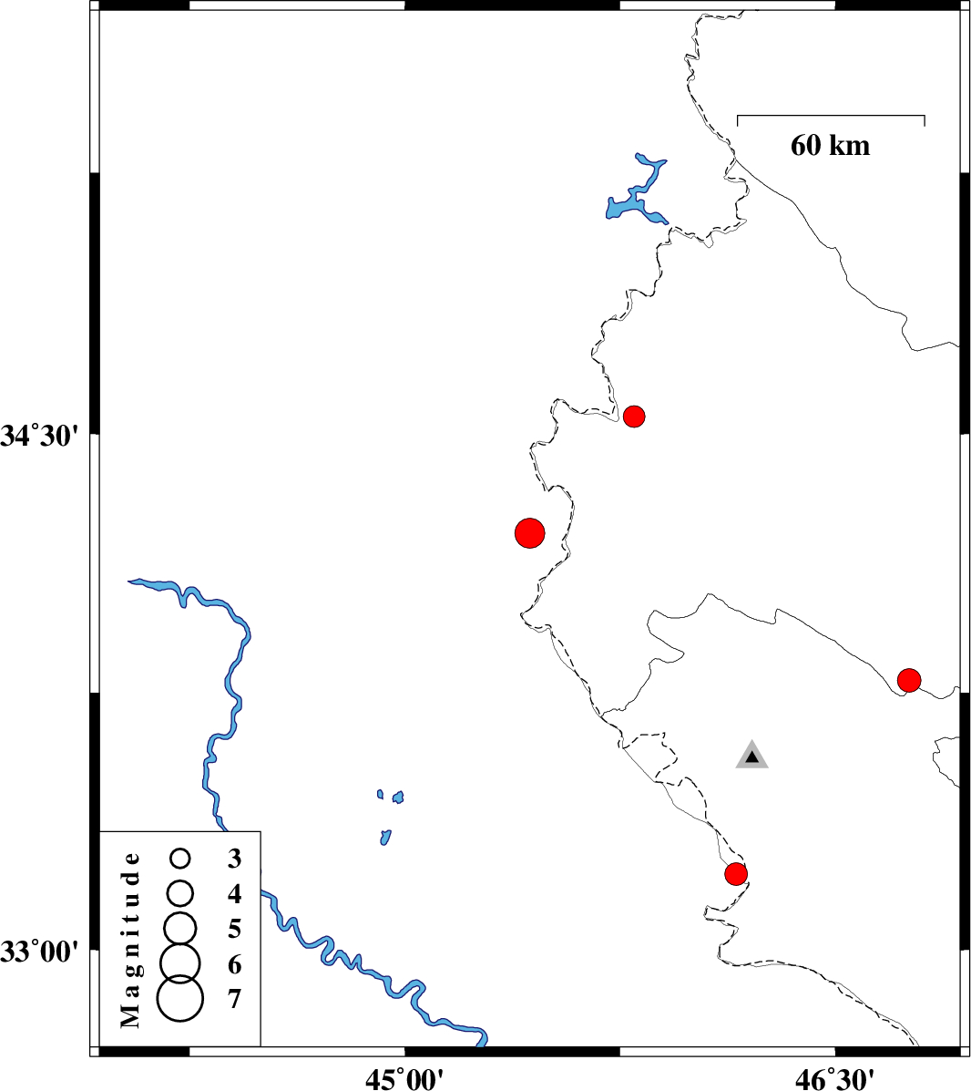 | 2025/11/01 | 11:25:02.5 | 14:55:02.5 | 34.214 | 45.435 | 12 | ML:4.7 | Iraq, 36 km South-West of Qasr-E-Shirin | ||