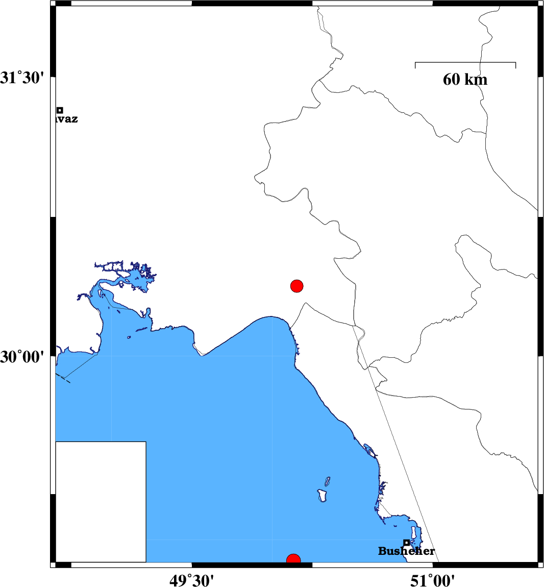 | 2025/11/10 | 12:22:09.6 | 15:52:09.6 | 28.884 | 50.133 | 12 | ML:3.9 | Persian Gulf, 69 km South-West of Busheher | ||