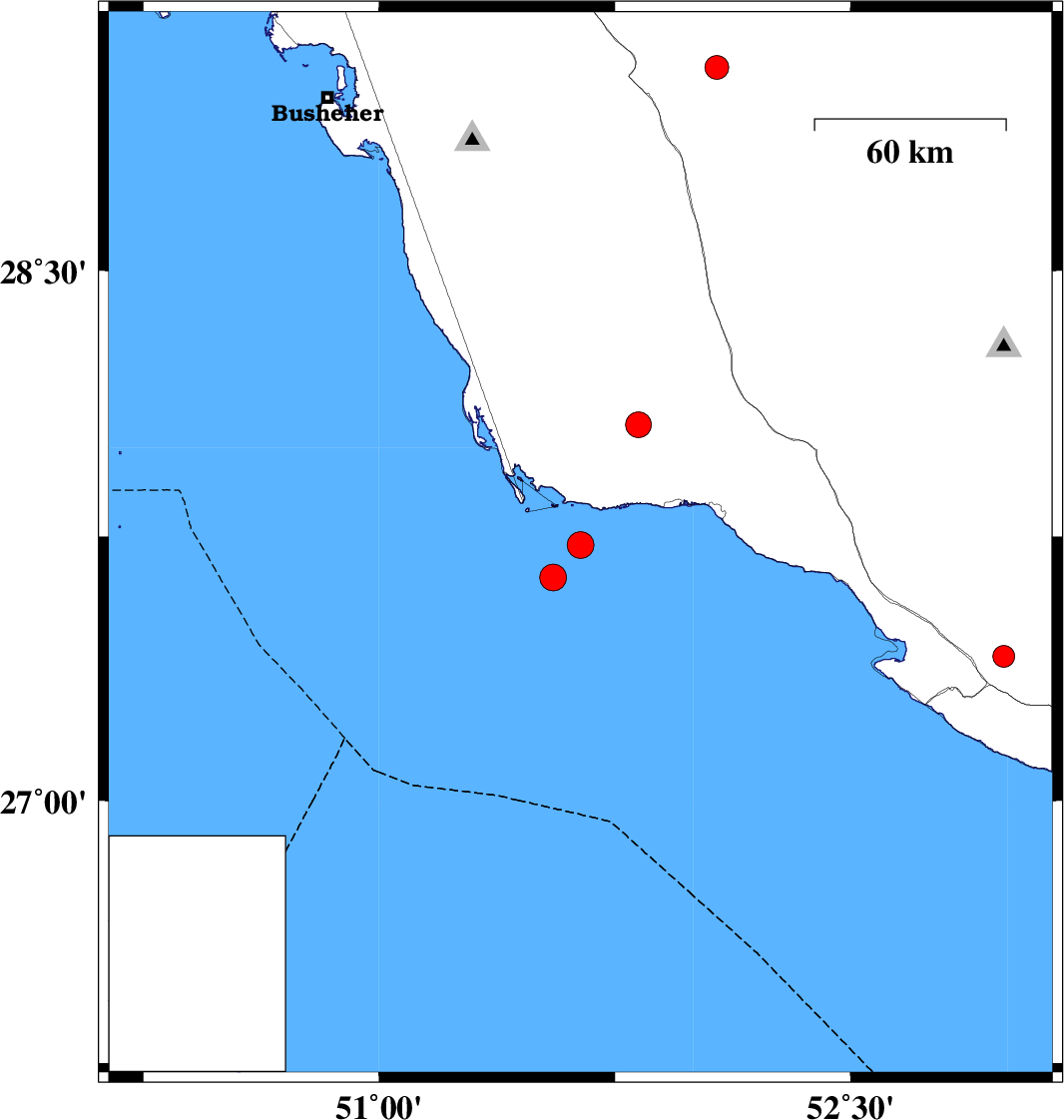 | 2025/11/14 | 19:33:51.4 | 23:03:51.4 | 27.634 | 51.554 | 12 | ML:3.8 | Persian Gulf, 54 km South-West of Bandar-e kangan | ||