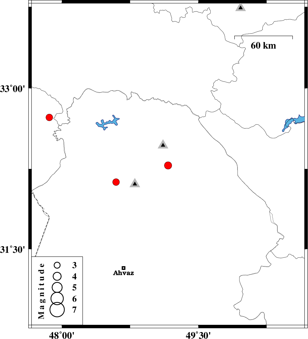 | 2025/11/15 | 05:56:18.1 | 09:26:18.1 | 32.283 | 49.167 | 12 | ML:3.6 | Khoozestan Province, 13 km South of Lali | ||