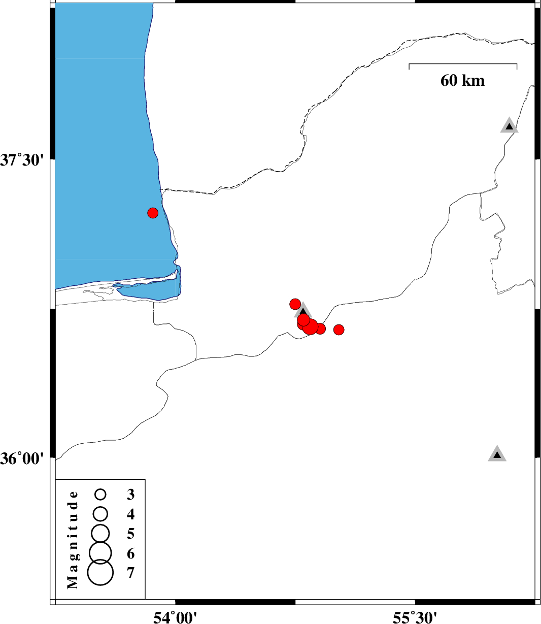 | 2025/10/21 | 08:57:04.3 | 12:27:04.3 | 36.645 | 55.022 | 12 | ML:2.9 | Semnan Province, 25 km North of Shahrud | ||