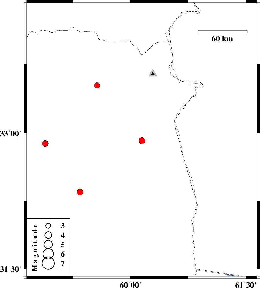 | 2024/11/18 | 07:51:00.2 | 11:21:00.2 | 32.885 | 58.89 | 5 | ML:3.6 | Khorasan(south) Province, 32 km -West of Birjand |