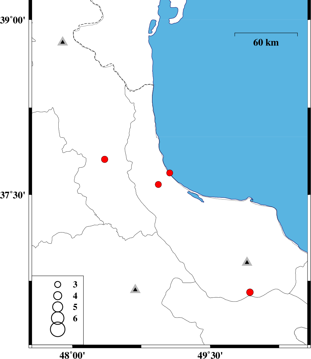 | 2025/11/24 | 07:26:34.6 | 10:56:34.6 | 37.689 | 49.059 | 12 | ML:3.1 | Caspian Sea, 18 km North of Rezvanshahr | ||