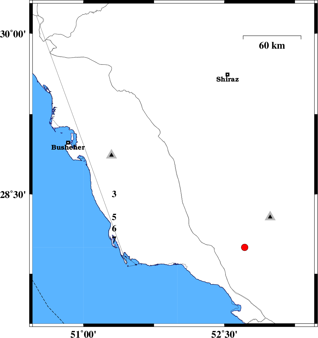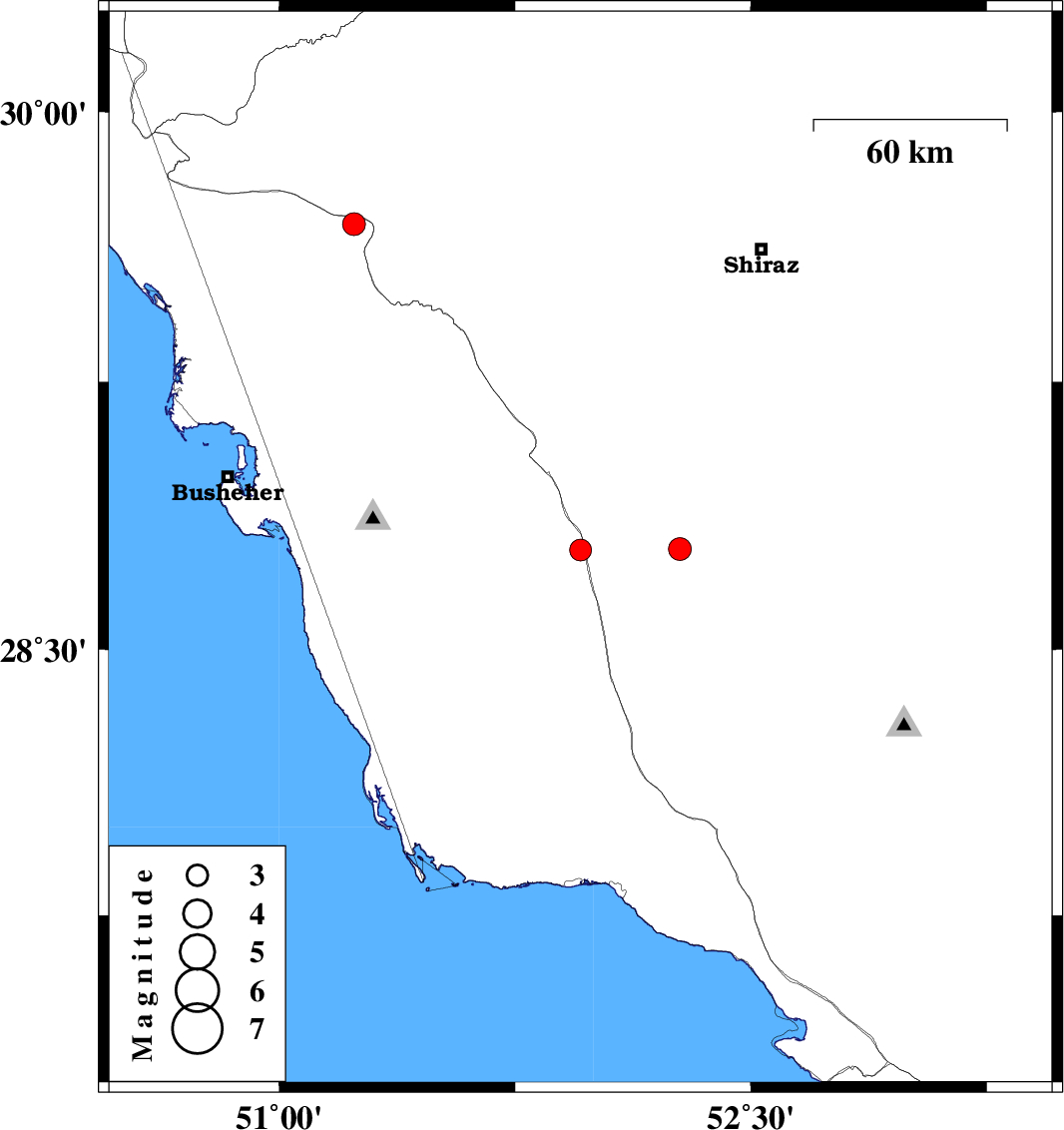 | 2025/12/10 | 12:58:12.2 | 16:28:12.2 | 29.689 | 51.237 | 12 | ML:3.2 | Bushehr Province, 48 km North of Borazjan | ||