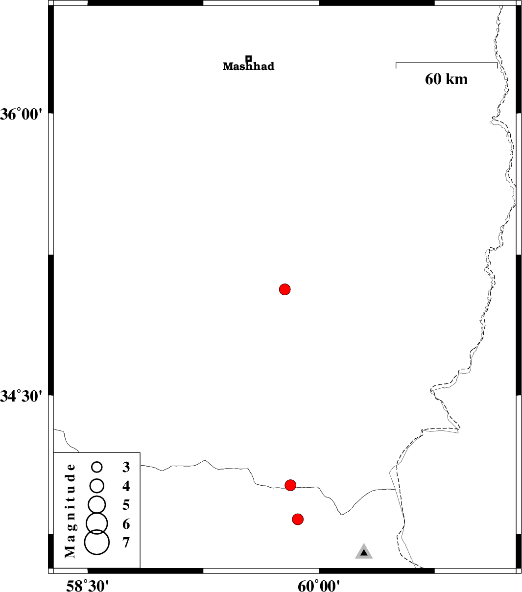 | 2026/01/05 | 07:29:51.9 | 10:59:51.9 | 34.014 | 59.814 | 12 | ML:3.2 | Khorasan(center) Province, 69 km South-West of Khaf | ||