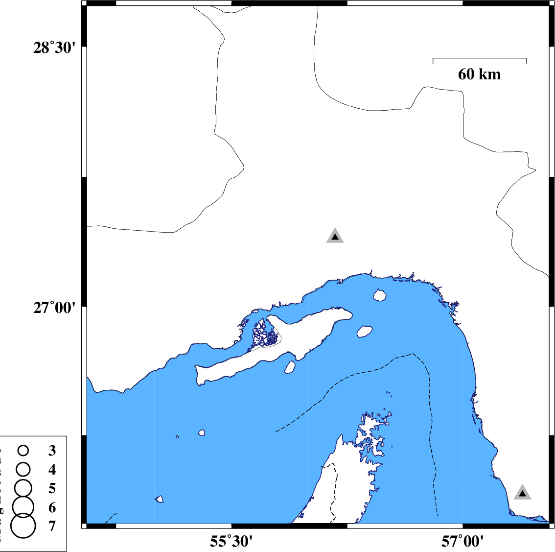 | 2026/01/14 | 13:19:59.0 | 16:49:59.0 | 27.234 | 56.06 | 12 | ML:3.4 | Hormozgan Province, 23 km -West of Bandar-e abbas |