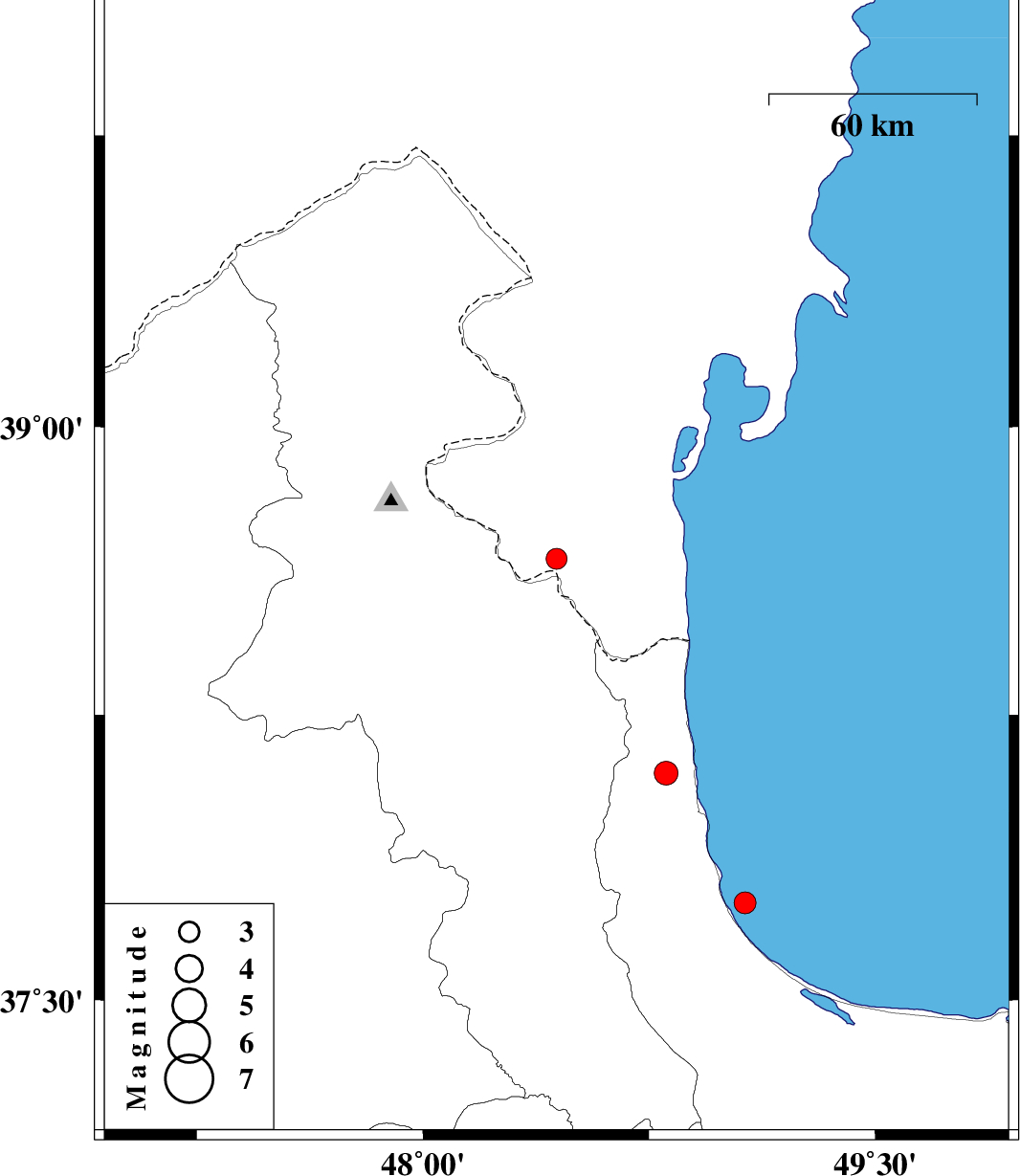 | 2026/01/18 | 20:24:06.7 | 23:54:06.7 | 38.098 | 48.807 | 16 | ML:3.5 | Gilan Province, 36 km South of Astara | ||