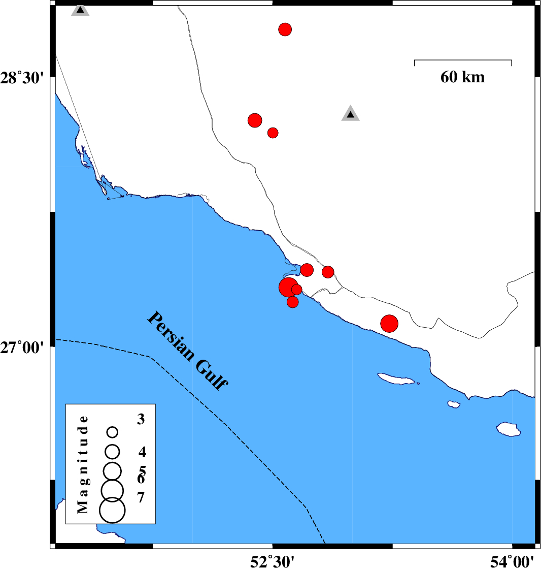 | 2026/02/01 | 05:11:18.2 | 08:41:18.2 | 27.296 | 52.526 | 12 | ML:5.5 | Persian Gulf, 45 km South-West of Mehr | ||