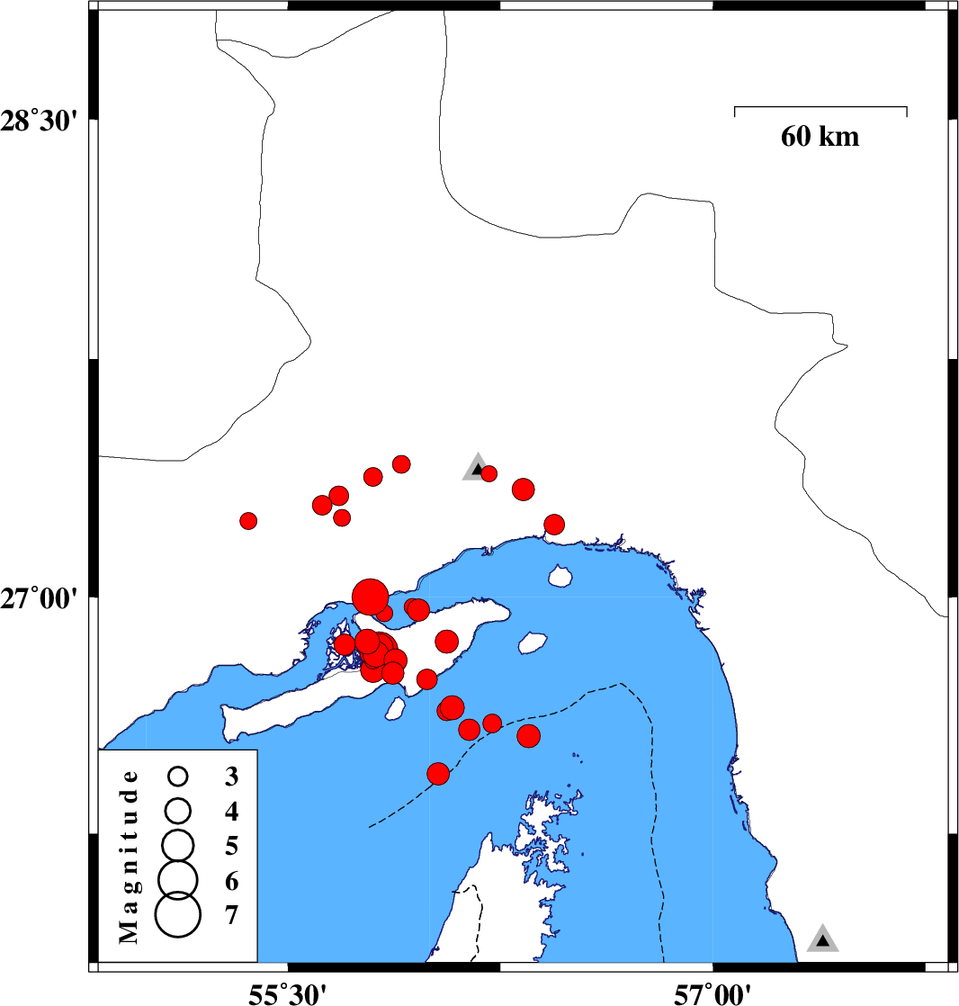 2005/11/27 | 10:22:19.2 | 13:52:19.2 | 26.83 | 55.82 | 8 | Mb:6 | Persian Gulf, 46 km South-West of Qeshm | ||