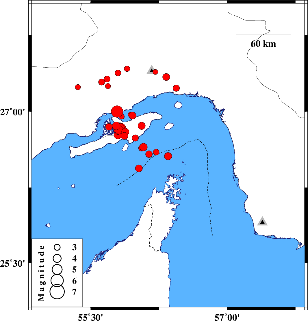 2005/11/27 | 10:22:19.2 | 13:52:19.2 | 26.83 | 55.82 | 8 | Mb:6 | Persian Gulf, 46 km South-West of Qeshm | ||