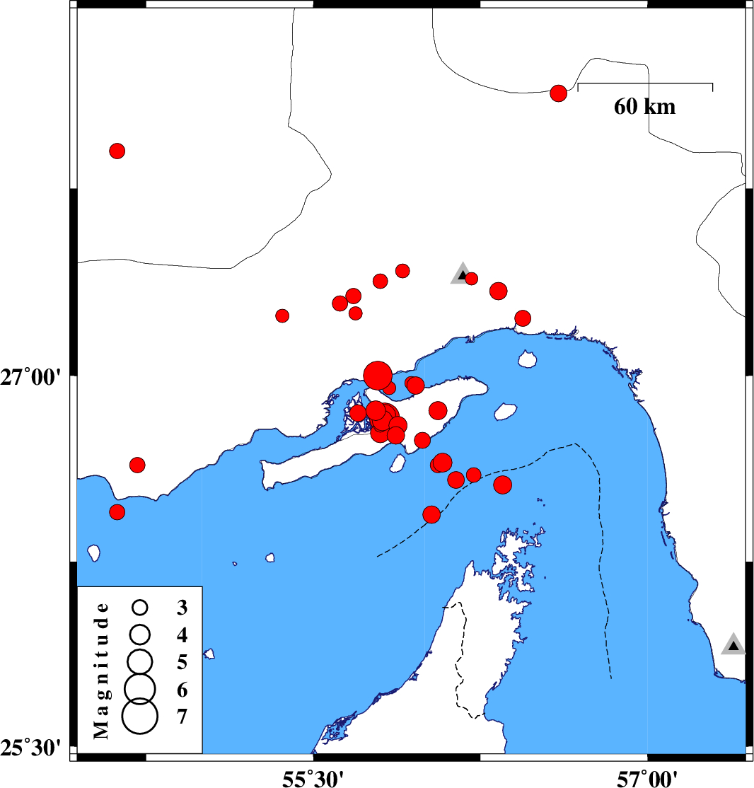 2005/11/27 | 16:30:39.1 | 20:00:39.1 | 27 | 55.79 | 14 | Mb:5.8 | Persian Gulf, 47 km West of Qeshm | ||