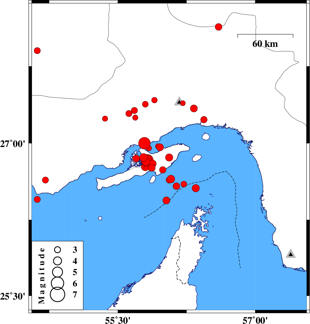2005/11/27 | 16:30:39.1 | 20:00:39.1 | 27 | 55.79 | 14 | Mb:5.8 | Persian Gulf, 47 km West of Qeshm | ||