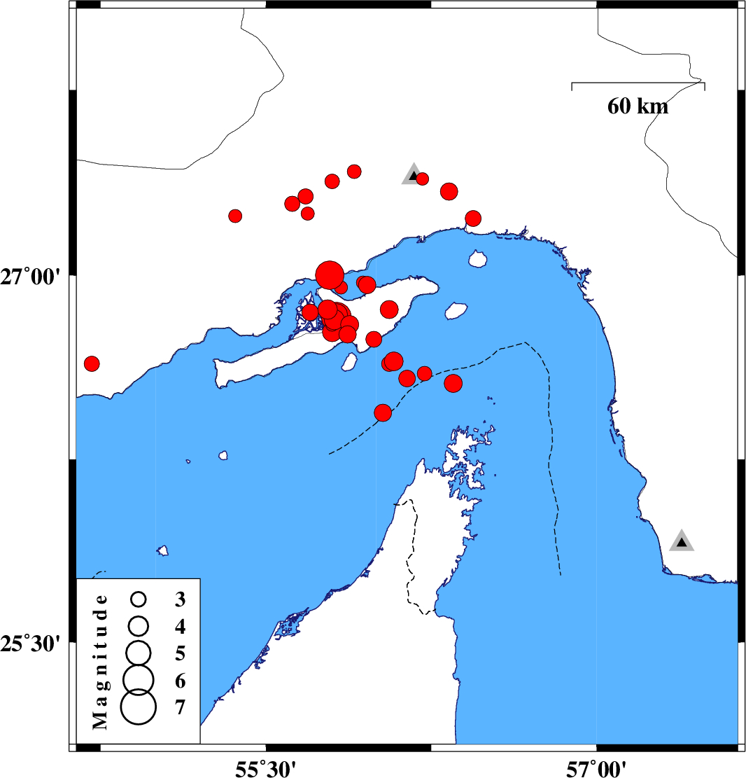 2005/11/27 | 10:22:19.2 | 13:52:19.2 | 26.83 | 55.82 | 8 | Mb:6 | Persian Gulf, 46 km South-West of Qeshm | ||