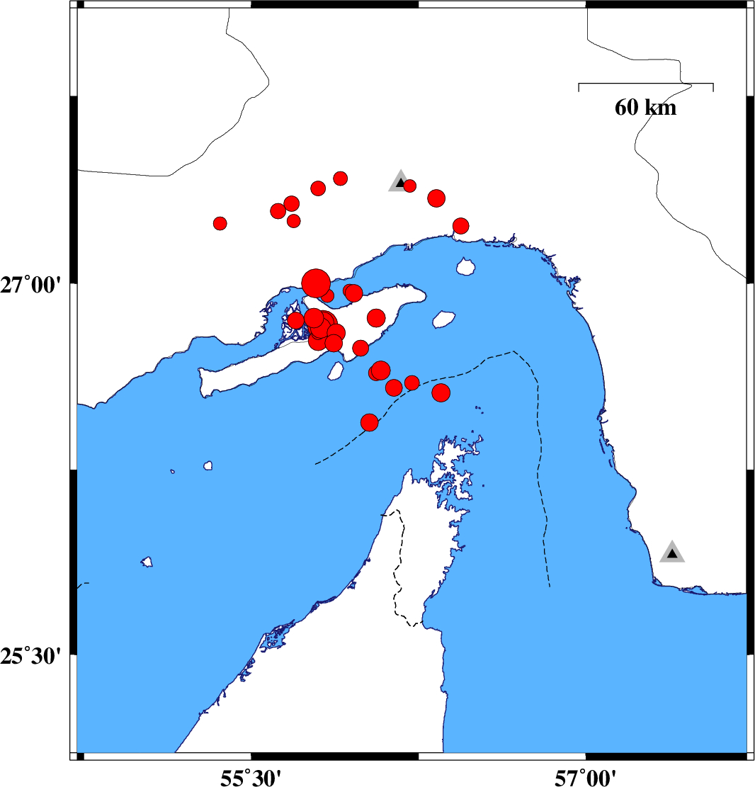 2005/11/27 | 10:22:19.2 | 13:52:19.2 | 26.83 | 55.82 | 8 | Mb:6 | Persian Gulf, 46 km South-West of Qeshm | ||