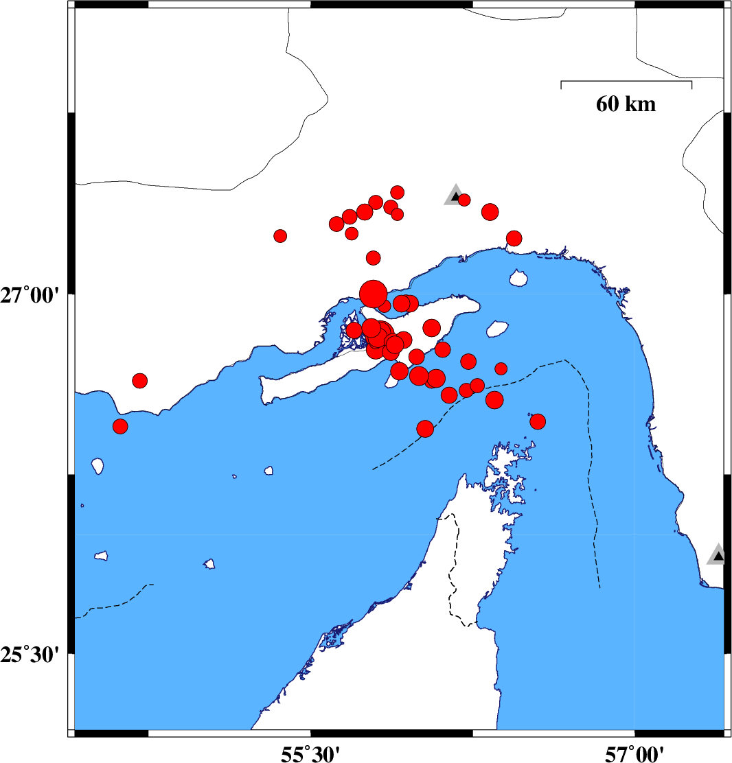 2005/11/27 | 16:30:39.1 | 20:00:39.1 | 27 | 55.79 | 14 | Mb:5.8 | Persian Gulf, 47 km West of Qeshm | ||
