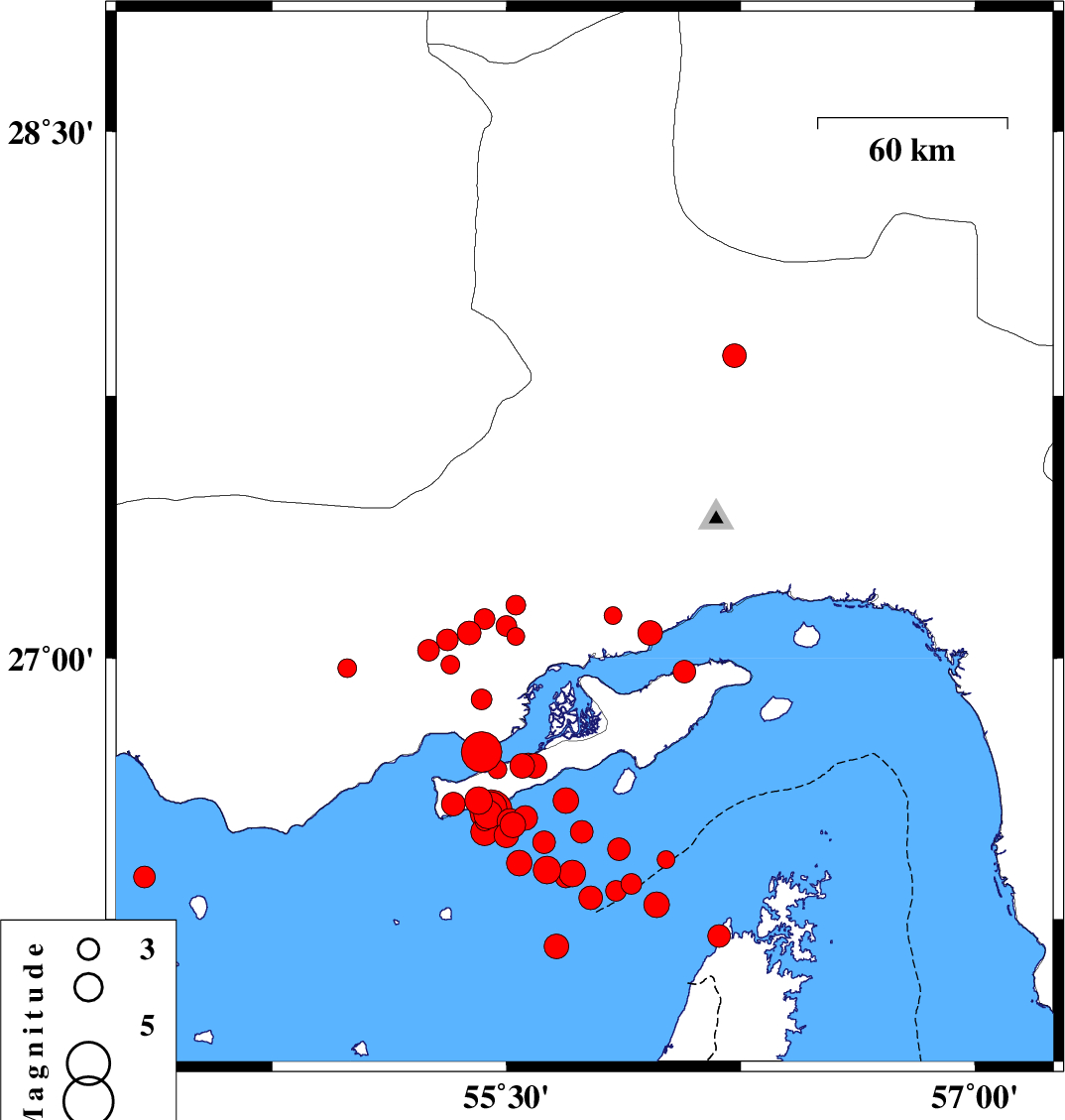 2005/11/27 | 10:22:19.2 | 13:52:19.2 | 26.83 | 55.82 | 8 | Mb:6 | Persian Gulf, 46 km South-West of Qeshm | ||