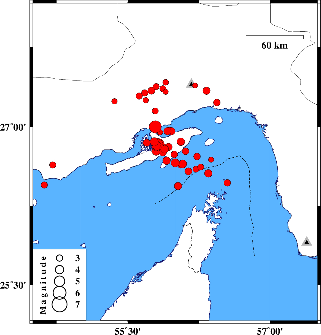 2005/11/27 | 16:30:39.1 | 20:00:39.1 | 27 | 55.79 | 14 | Mb:5.8 | Persian Gulf, 47 km West of Qeshm | ||