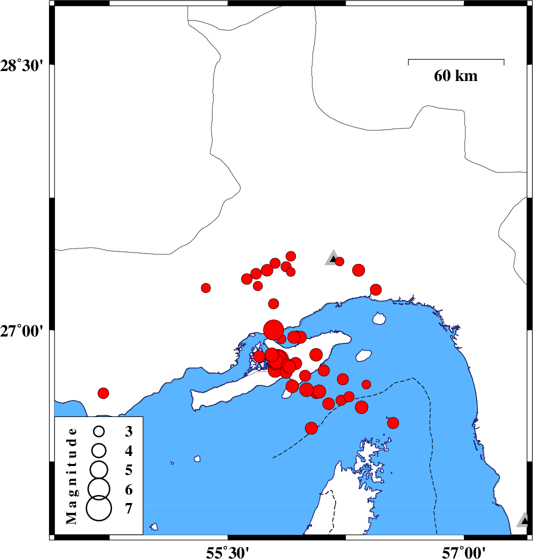 2005/11/27 | 16:30:39.1 | 20:00:39.1 | 27 | 55.79 | 14 | Mb:5.8 | Persian Gulf, 47 km West of Qeshm | ||