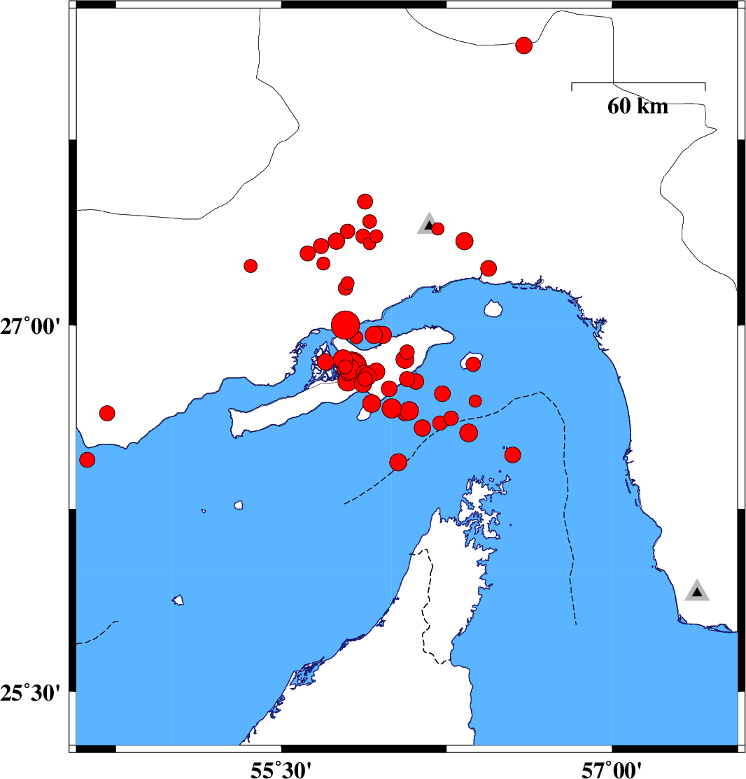 2005/11/27 | 10:22:19.2 | 13:52:19.2 | 26.83 | 55.82 | 8 | Mb:6 | Persian Gulf, 46 km South-West of Qeshm | ||