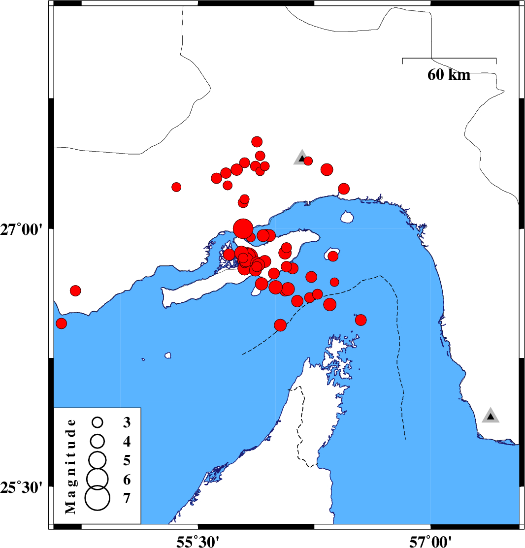 2005/11/27 | 10:22:19.2 | 13:52:19.2 | 26.83 | 55.82 | 8 | Mb:6 | Persian Gulf, 46 km South-West of Qeshm | ||