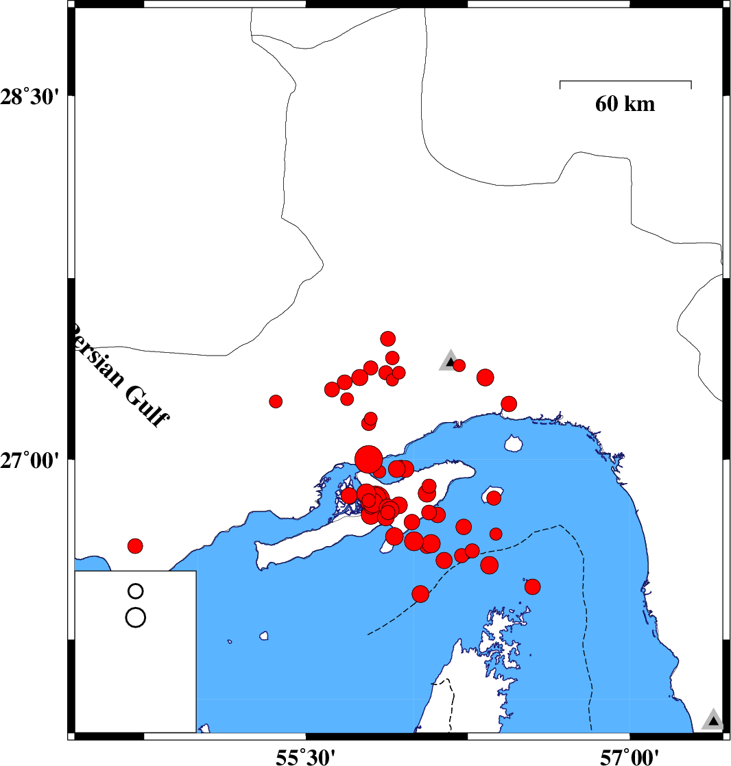 2005/11/27 | 10:22:19.2 | 13:52:19.2 | 26.83 | 55.82 | 8 | Mb:6 | Persian Gulf, 46 km South-West of Qeshm | ||