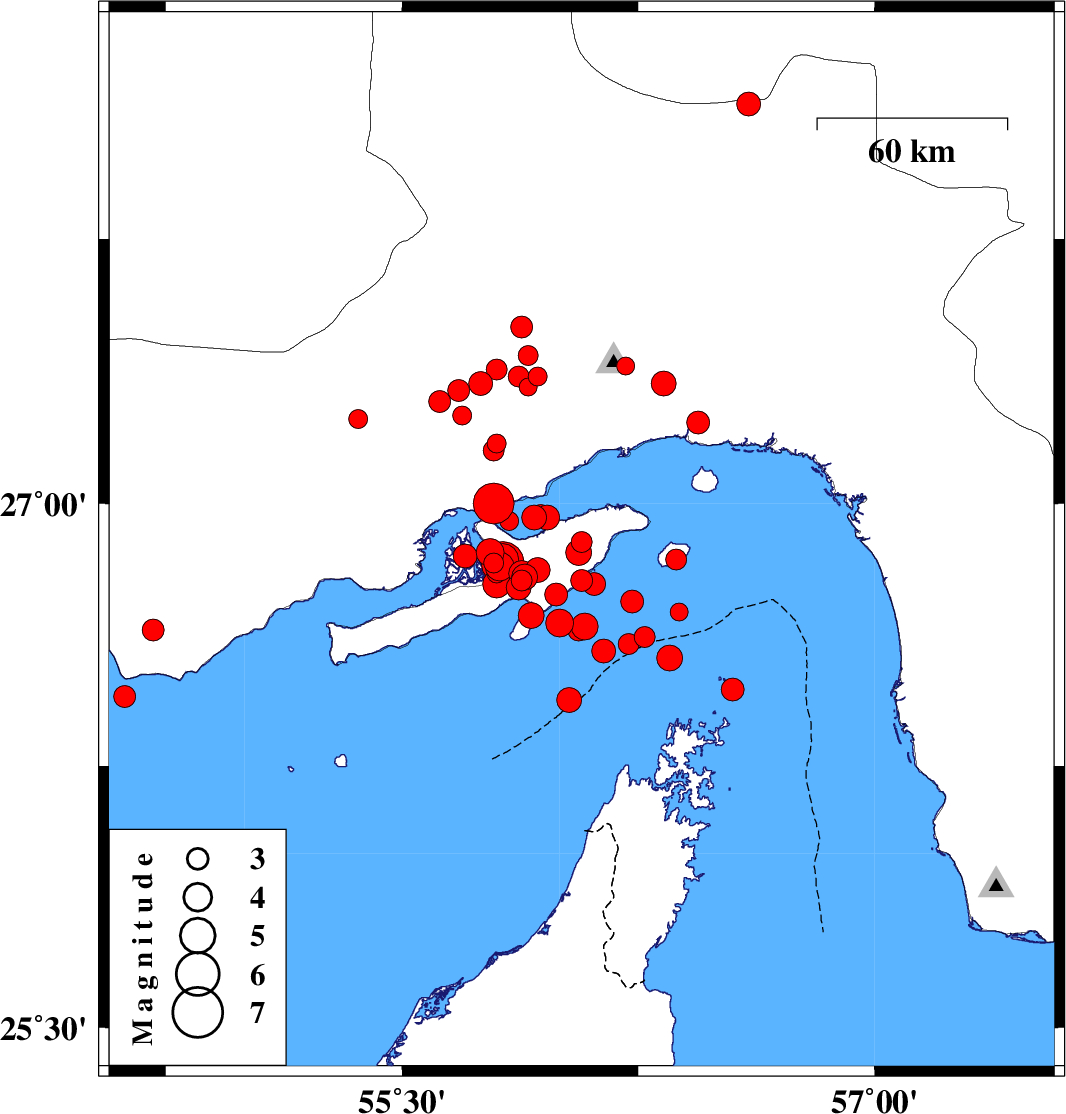 2005/11/27 | 10:22:19.2 | 13:52:19.2 | 26.83 | 55.82 | 8 | Mb:6 | Persian Gulf, 46 km South-West of Qeshm | ||