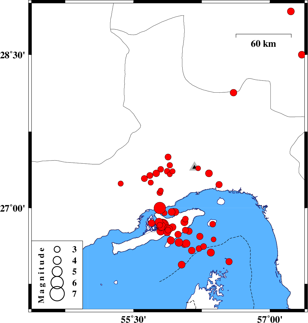2005/11/27 | 10:22:19.2 | 13:52:19.2 | 26.83 | 55.82 | 8 | Mb:6 | Persian Gulf, 46 km South-West of Qeshm | ||