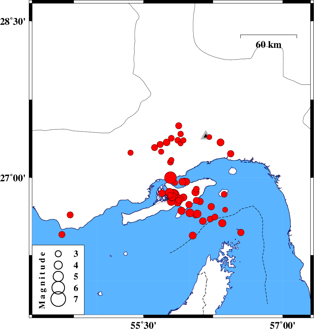 2005/11/27 | 10:22:19.2 | 13:52:19.2 | 26.83 | 55.82 | 8 | Mb:6 | Persian Gulf, 46 km South-West of Qeshm | ||
