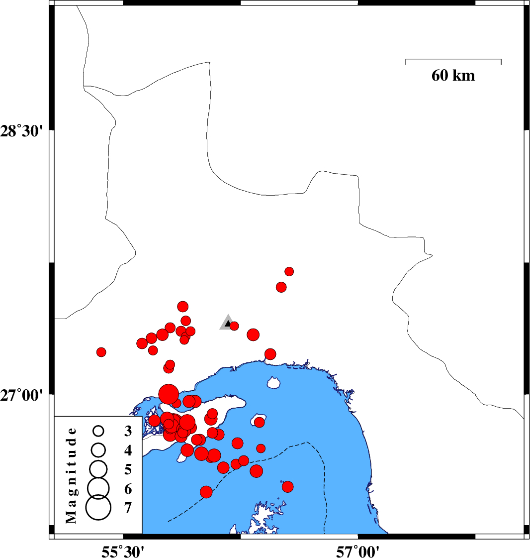 2005/11/27 | 10:22:19.2 | 13:52:19.2 | 26.83 | 55.82 | 8 | Mb:6 | Persian Gulf, 46 km South-West of Qeshm | ||
