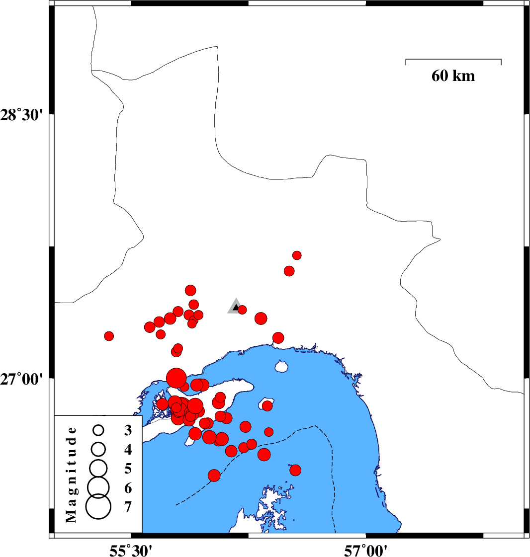 2005/11/27 | 10:22:19.2 | 13:52:19.2 | 26.83 | 55.82 | 8 | Mb:6 | Persian Gulf, 46 km South-West of Qeshm | ||