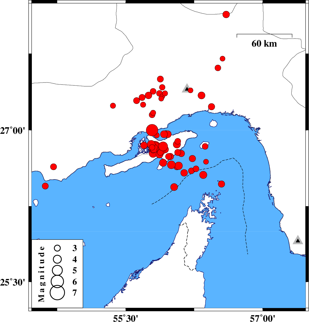 2005/11/27 | 10:22:19.2 | 13:52:19.2 | 26.83 | 55.82 | 8 | Mb:6 | Persian Gulf, 46 km South-West of Qeshm | ||