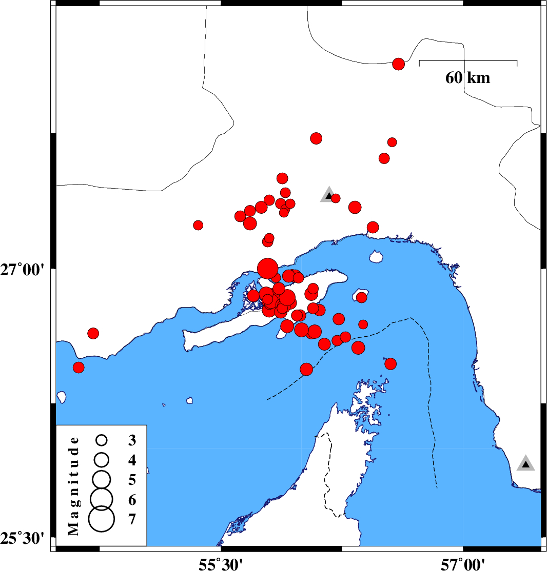 2005/11/27 | 10:22:19.2 | 13:52:19.2 | 26.83 | 55.82 | 8 | Mb:6 | Persian Gulf, 46 km South-West of Qeshm | ||