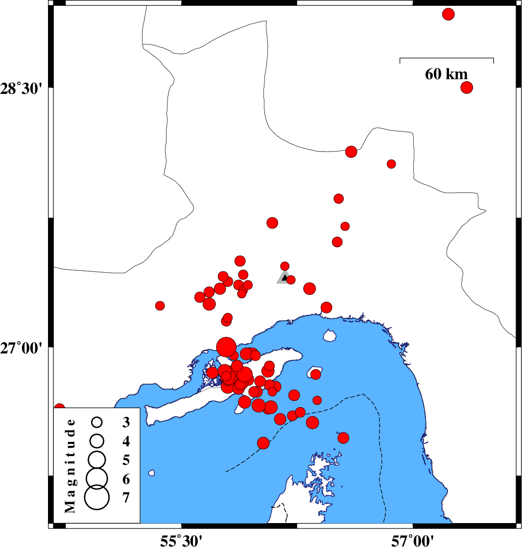 2005/11/27 | 10:22:19.2 | 13:52:19.2 | 26.83 | 55.82 | 8 | Mb:6 | Persian Gulf, 46 km South-West of Qeshm | ||