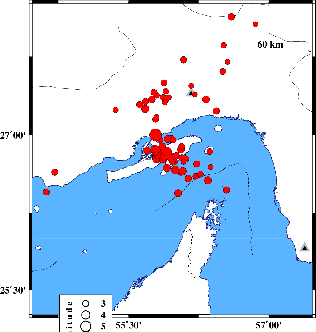 2005/11/27 | 10:22:19.2 | 13:52:19.2 | 26.83 | 55.82 | 8 | Mb:6 | Persian Gulf, 46 km South-West of Qeshm | ||
