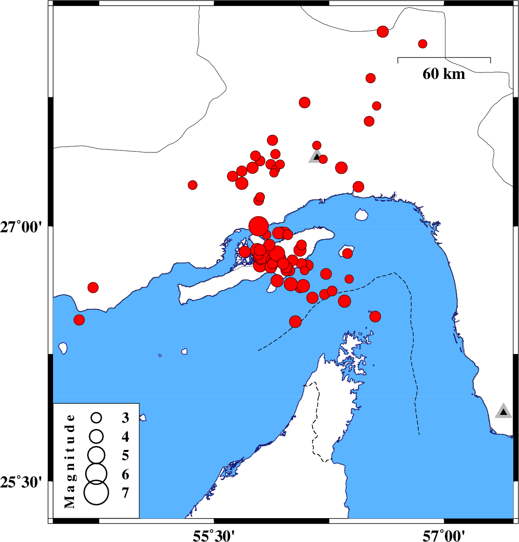 2005/11/27 | 10:22:19.2 | 13:52:19.2 | 26.83 | 55.82 | 8 | Mb:6 | Persian Gulf, 46 km South-West of Qeshm | ||