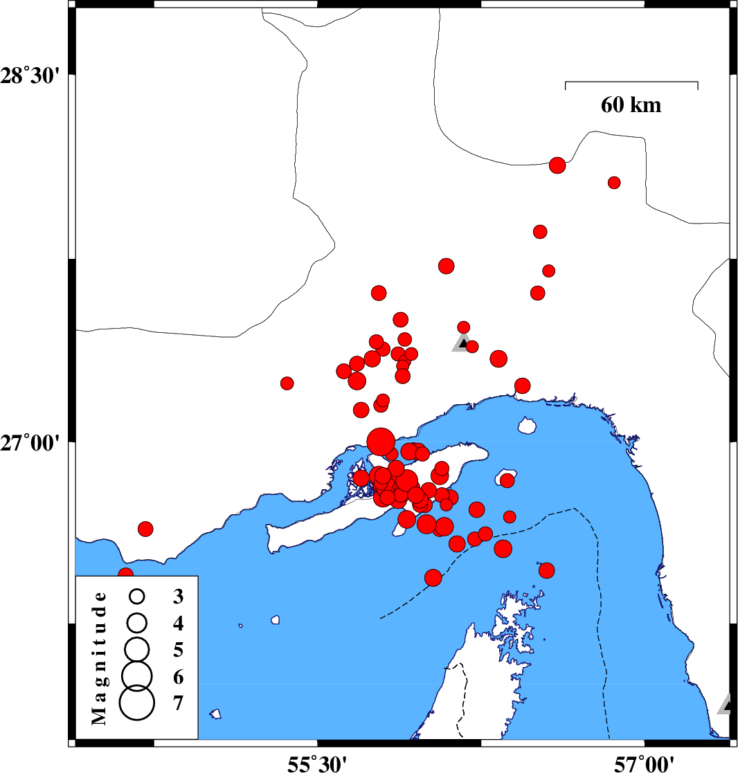 2005/11/27 | 10:22:19.2 | 13:52:19.2 | 26.83 | 55.82 | 8 | Mb:6 | Persian Gulf, 46 km South-West of Qeshm | ||