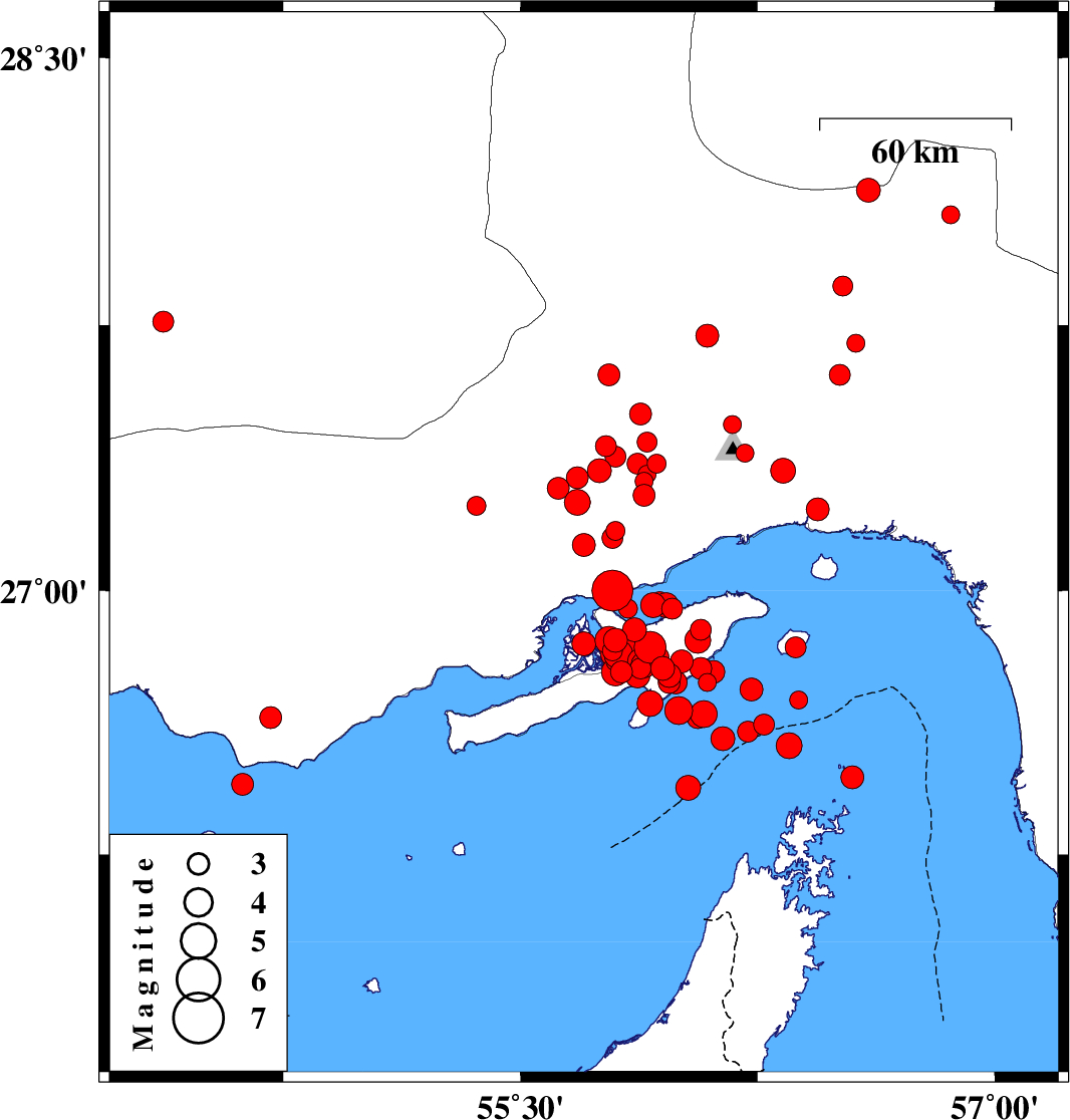 2005/11/27 | 10:22:19.2 | 13:52:19.2 | 26.83 | 55.82 | 8 | Mb:6 | Persian Gulf, 46 km South-West of Qeshm | ||