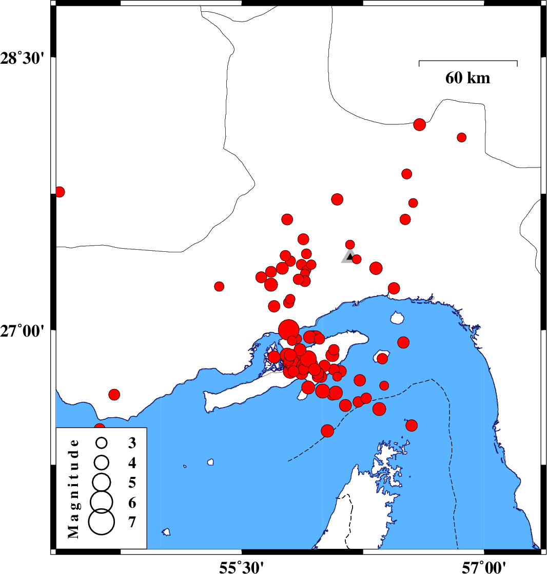 2005/11/27 | 10:22:19.2 | 13:52:19.2 | 26.83 | 55.82 | 8 | Mb:6 | Persian Gulf, 46 km South-West of Qeshm | ||