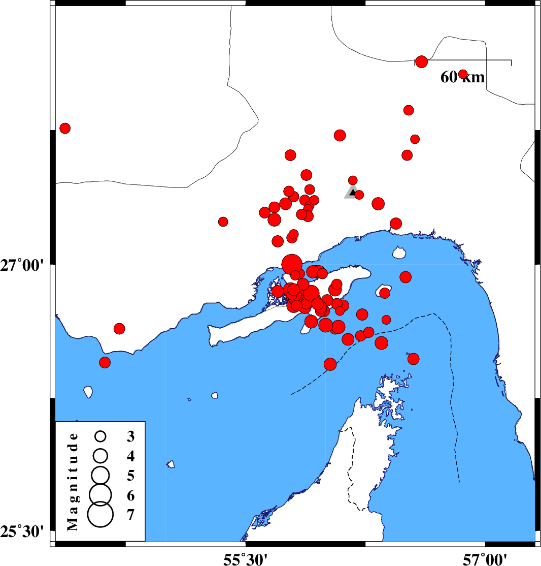 2005/11/27 | 10:22:19.2 | 13:52:19.2 | 26.83 | 55.82 | 8 | Mb:6 | Persian Gulf, 46 km South-West of Qeshm | ||