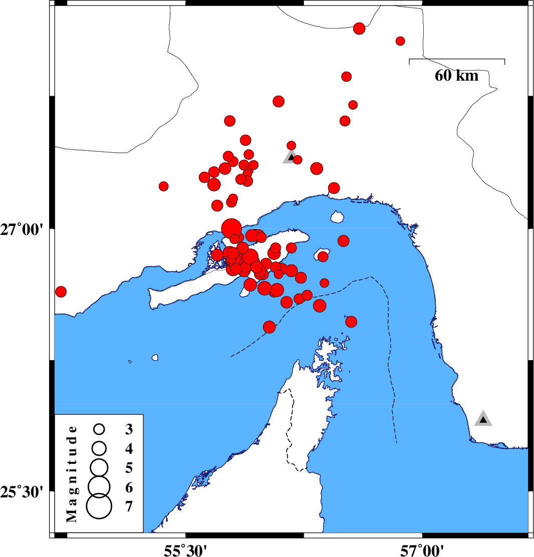 2005/11/27 | 16:30:39.1 | 20:00:39.1 | 27 | 55.79 | 14 | Mb:5.8 | Persian Gulf, 47 km West of Qeshm | ||