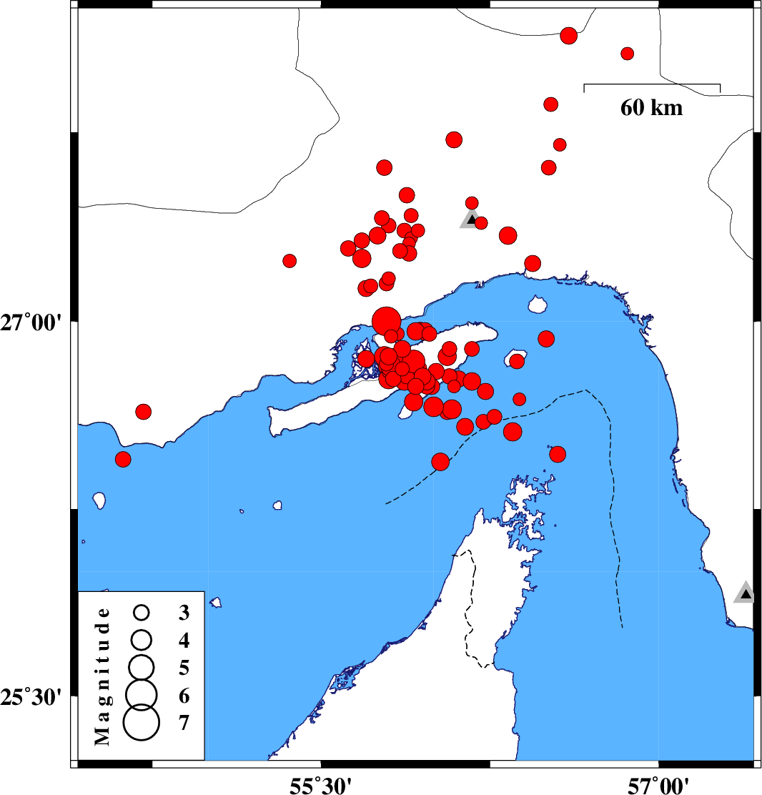 2005/11/27 | 10:22:19.2 | 13:52:19.2 | 26.83 | 55.82 | 8 | Mb:6 | Persian Gulf, 46 km South-West of Qeshm | ||