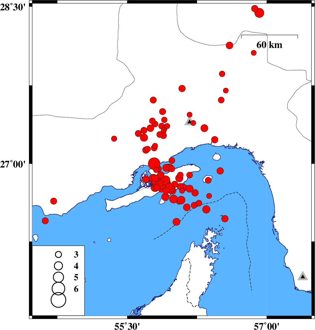 2005/11/27 | 16:30:39.1 | 20:00:39.1 | 27 | 55.79 | 14 | Mb:5.8 | Persian Gulf, 47 km West of Qeshm | ||